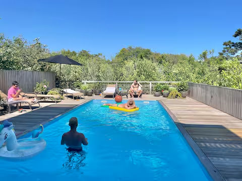 18 Widgeon Walk is a private residence in Fire Island Pines. Private rental units with private entrances, kitchen, living room, and bathrooms are available for summer rentals for 3-7 days. Three minute walk from the harbor and three minute walk to the beach. All bathrooms have a walk-in shower and a Toto washlet. Shared hot tub, 91 degree heated pool, and outdoor shower. Shared roof deck with a 360 degrees view of the Pines. Small gym beneath the house. New construction (2018). Eighty-percent of rental fees are donated to charities serving the performing arts and HIV prevention.